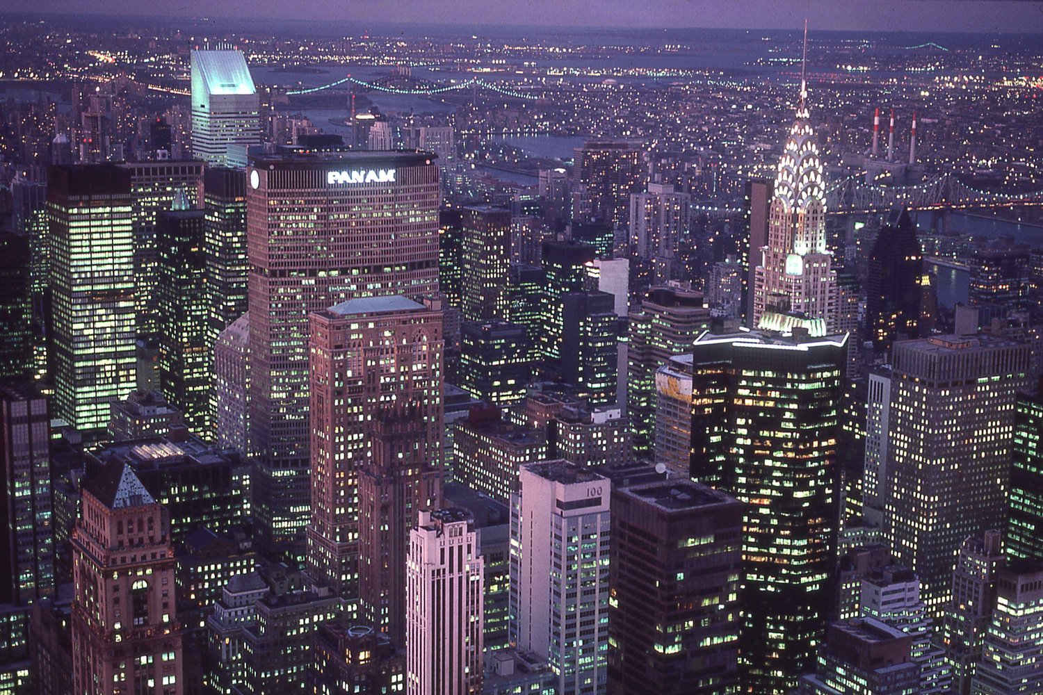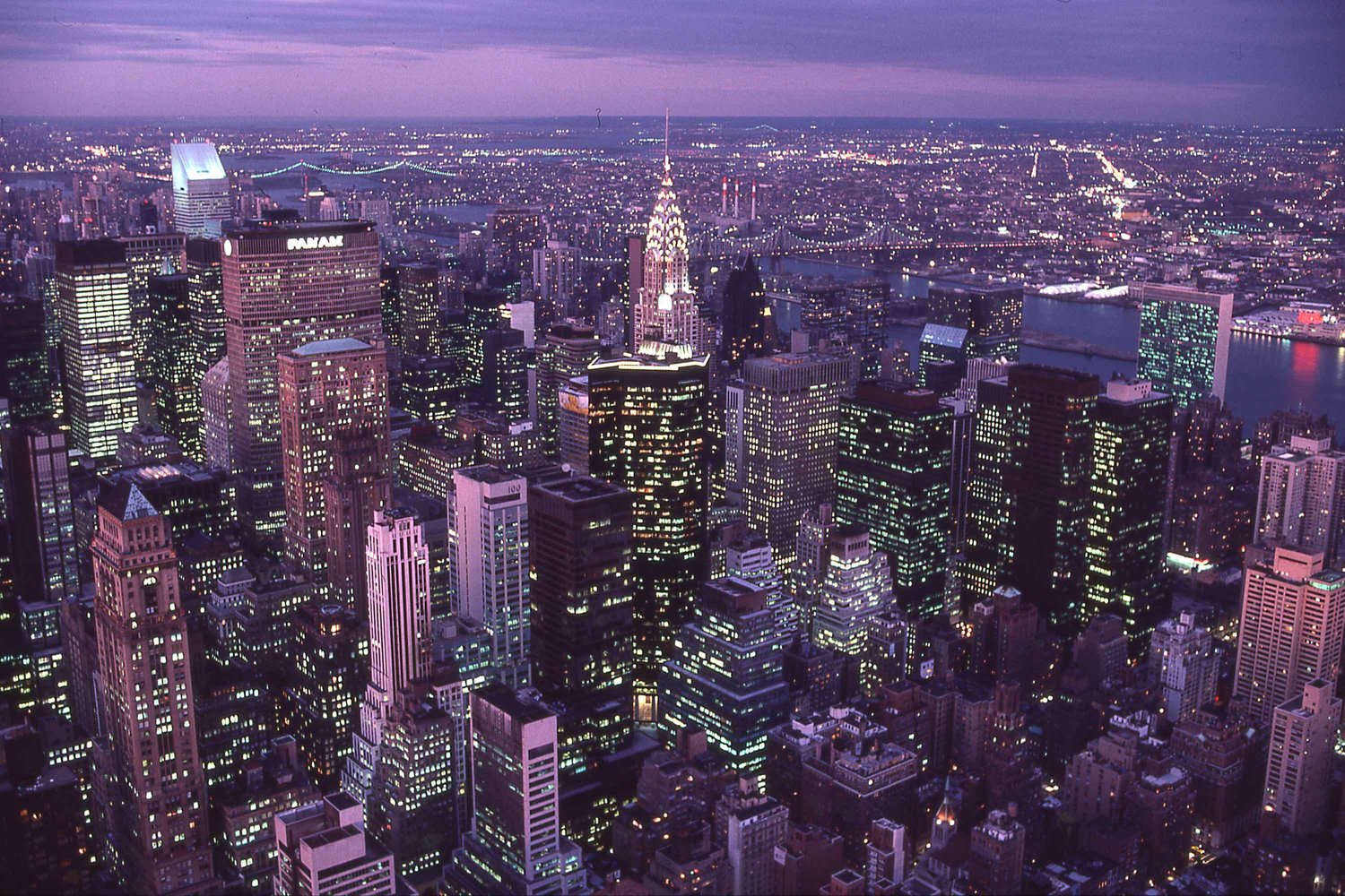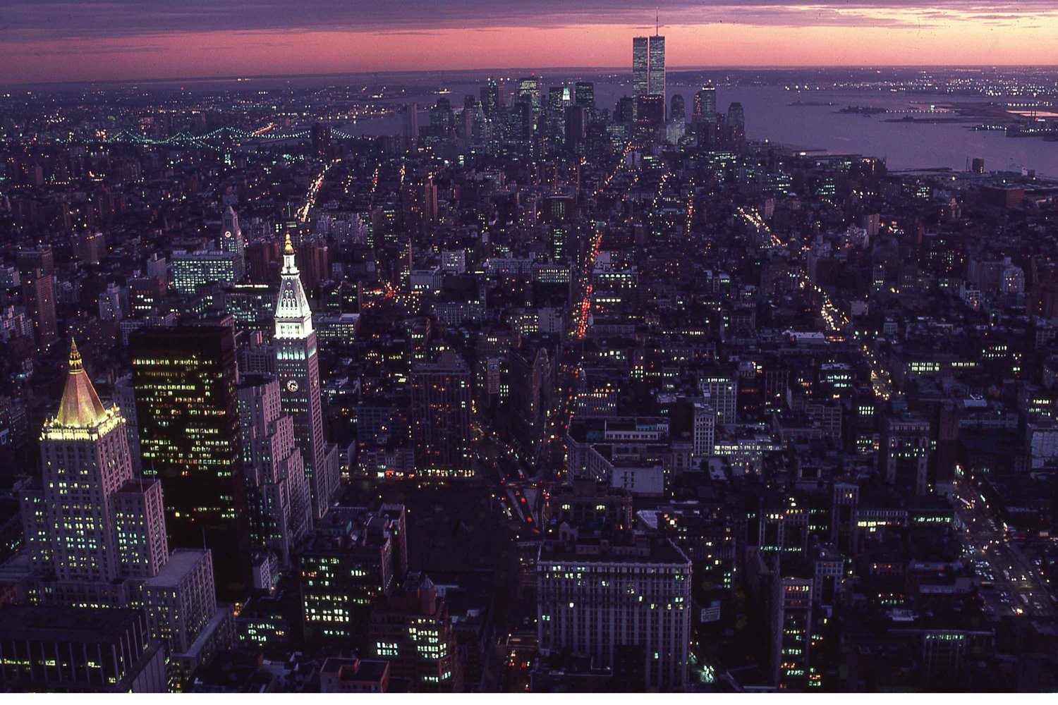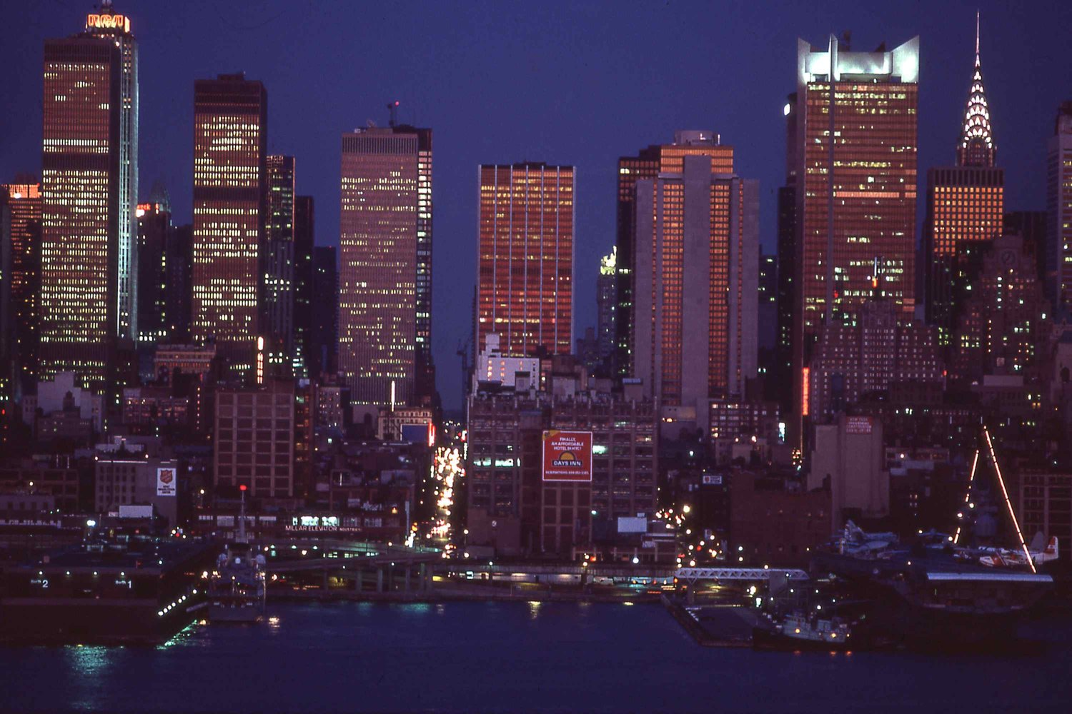 At night, New York City's skyline is defined by the stark contrast of towering skyscrapers against the darkness, their illuminated windows creating a precise grid of light.