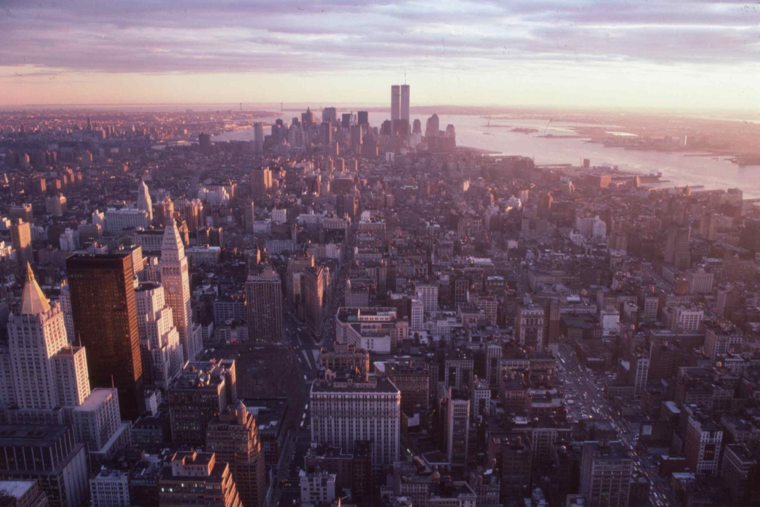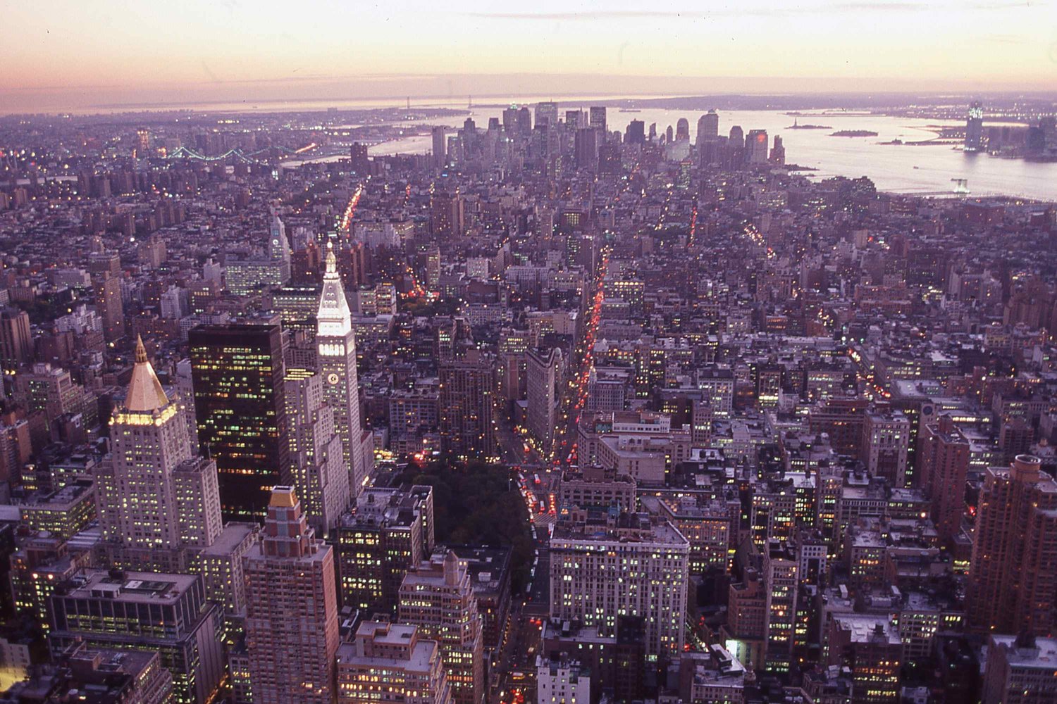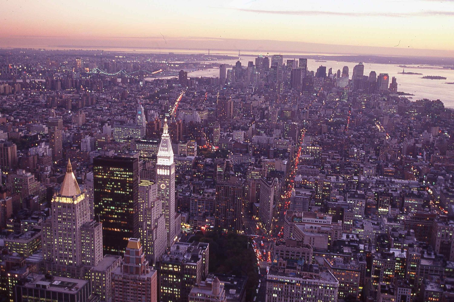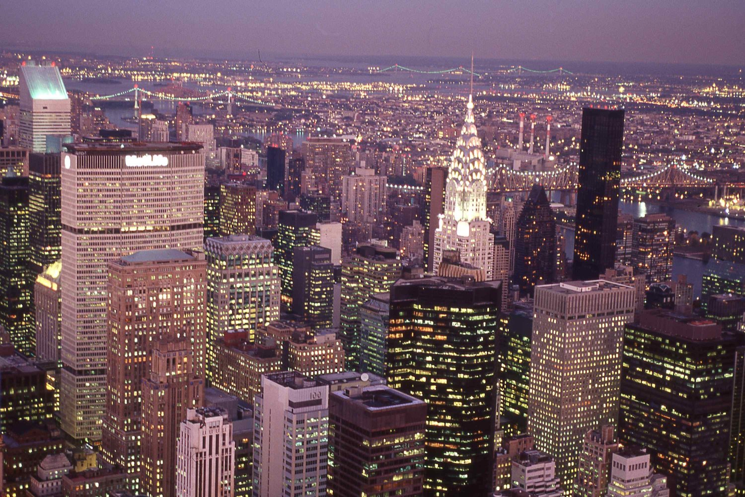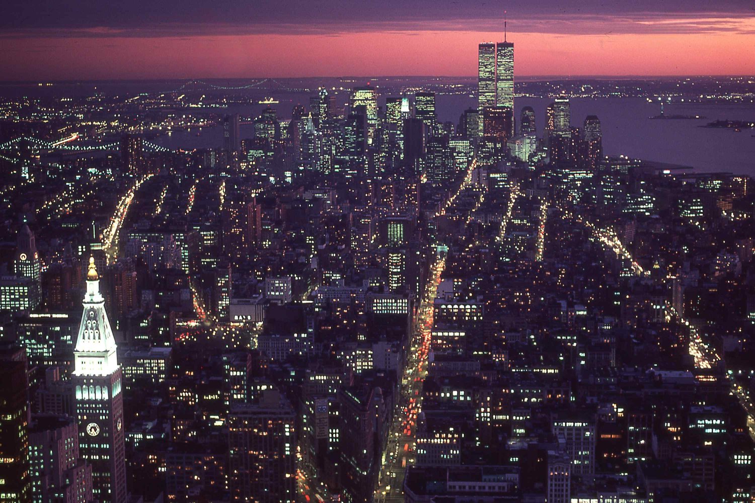 At night, New York City's skyline is defined by the stark contrast of towering skyscrapers against the darkness, their illuminated windows creating a precise grid of light.